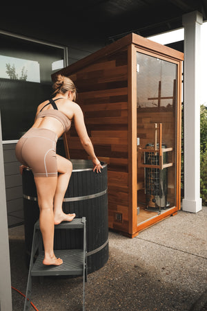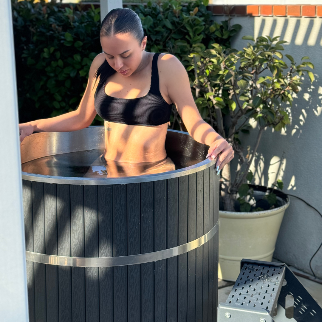 Pair our Sweat Box Sauna with contrast therapy by using our Wood-Steel Cold Tub System. This device, designed for efficiency and comfort, allows for full-body submersion in an upright position. The outside is made from wood inspired vinyl planking and the inside constructed from highly durable stainless steel, it promises lasting use. The non-toxic, easy-to-clean materials make this compact barrel an essential addition for home-based or commercial wellness and recovery. It integrates effortlessly into any environment, enhancing your wellness journey with the style and the effectiveness of contrast therapy.