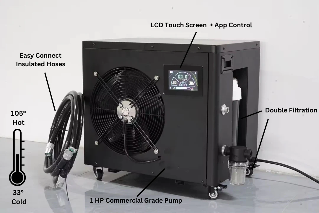 The Cold Plunge is extremely simple to set up. The chiller is connected to the tub with "easy connect" hoses. Then you simple fill with water and turn it on!